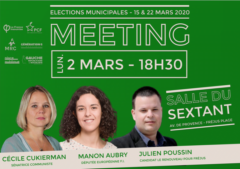 La sénatrice communiste Cécile CUKIERMAN et la députée européenne insoumise Manon AUBRY tiendront un meeting à Fréjus le lundi 2 mars salle du Sextant pour soutenir la liste emmenée par Julien POUSSIN. Cette liste rassemble des citoyens engagés à gauche, des syndicalistes, des militants communistes et insoumis. Depuis quinze ans aucune liste de gauche rassemblée ne s’était présentée à Fréjus. Cette liste a reçu le soutien de la GRS et de génération.S. Le mouvement social historique contre la réforme des retraites est porteur de justice sociale, d’égalité entre les femmes et les hommes ; comment les élections municipales pourraient être…