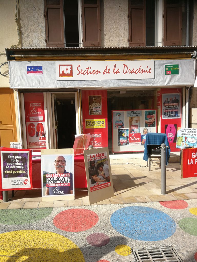 Dans le cadre du centenaire du PCF les communistes de la Dracénie ont réalisé une magnifique exposition d’affiches dans la rue devant leur local. Des récentes et des anciennes. Beaucoup de passants ont signé la pétition nationale pour l’emploi et pour que les milliards du plan de relance ( argent public ) aille aux salariés pour augmenter les salaires et sécuriser les emplois. Prise de parole du secrétaire départemental et apéritif. Les communistes de la Dracénie font preuve d’un remarquable dynamisme ! Pas étonnant que des salariés notamment de la santé rejoignent le PCF.
