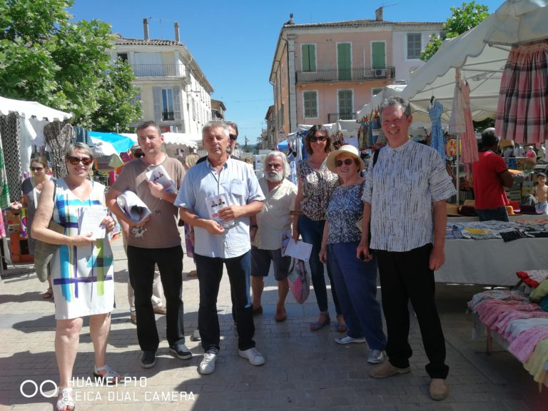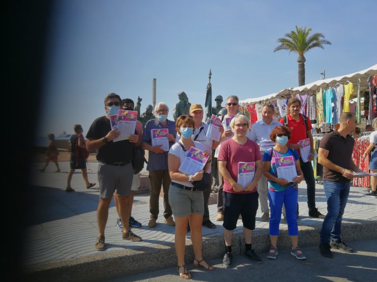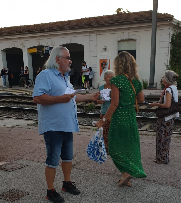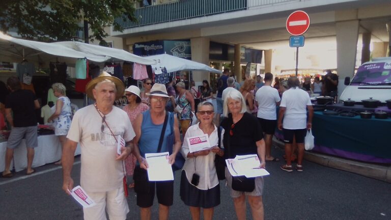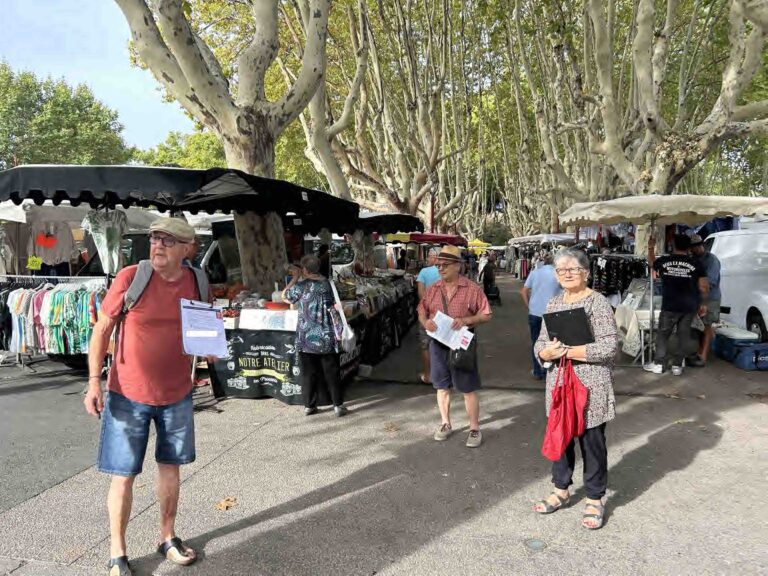 28 septembre 2023. Après des distributions de tracts à la gare SNCF d’Ollioules, puis sur le marché d’Ollioules, c’est au tour du marché de Sanary. Ici, la saison estivale n’est pas encore vraiment terminée et de nombreux touristes flânent aux abords du port, malgré la reprise des travaux d’aménagement du quai Charles De Gaulle. La plupart n’ont pas la tête à la politique, fort heureusement, ce n’est pas le cas de tous et surtout pas des locaux. Ainsi, des discussions se nouent et nous confortent dans la nécessité de tenir bon sur la prise en compte des problèmes du quotidien…