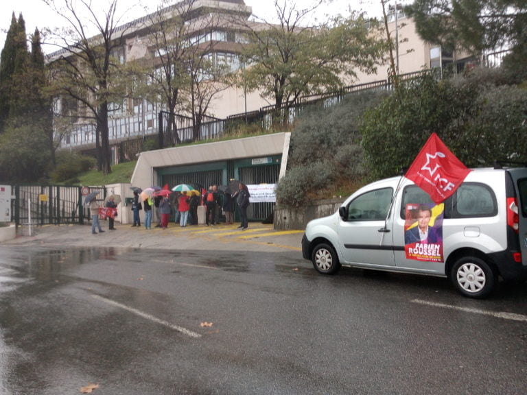 La lutte des agents des finances publiques varois continue ! Toujours déterminés, après l’accueil au palais Neptune à Toulon des maires du Var obligeant le directeur départemental à venir s’expliquer, ce jeudi 17 octobre les agents étaient dans l’action à Grimaud devant la trésorerie menacée de fermeture. Ils ont reçu le soutien de Pierre Daspre pour le pcf Var et le soutien du premier adjoint de Grimaud. Au même moment les agents de Fréjus étaient aussi dans l’action. Les usagers, les mairies n’auront plus d’interlocuteurs à Grimaud et devront se déplacer à Fréjus (35 km) ou faire appel au privé…