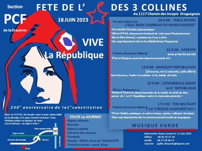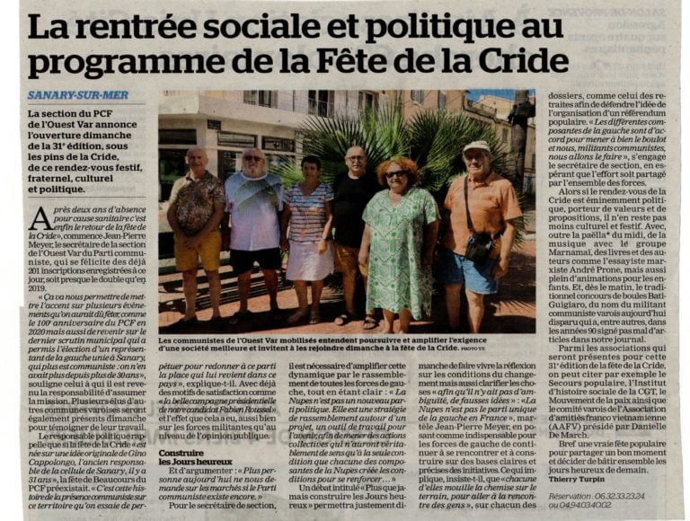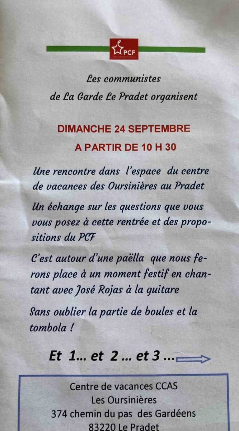 Ce vendredi soir 6 septembre à Carnoules les communistes varois et leurs amis avaient rendez-vous pour leur traditionnelle assemblée de rentrée. Devant 80 personnes Pierre Daspre secrétaire départemental a décrit la situation nationale et internationale et appelé à un travail politique offensif dès ces premiers jours de septembre car il y a urgence pour apaiser un climat de tension internationale détestable, urgence pour arrêter la folie du capitalisme en matière d’écologie, urgence pour éradiquer le chômage et la misère en France et dans le monde. Les communistes depuis leur 38ème congrès sont confortés dans la justesse de leur choix :…