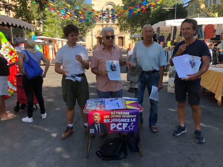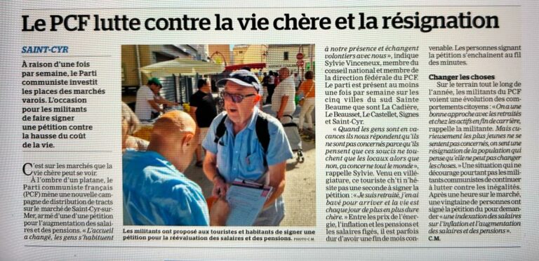 Depuis le début dé l’été les communistes varois, malgré la chaleur estivale, sont présents sur les marchés. Ils font signer la pétition nationale pour indexer les salaires sur l’inflation ce qui paraît une évidence mais ne l’est pas au pays du capitalisme débridé français. Les députés communistes ont déposé une proposition de loi en ce sens. Ainsi en ce début du mois d’août pas de pause pour les militants de la section Martha Desrumeaux du Sud Sainte-Baume : le vendredi sur le marché du Beausset, le samedi au plan du Castellet et le dimanche sur le marché de Saint-Cyr !…