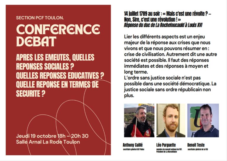DEBAT TRES RICHE sur la SECURITE à l’initiative de la section du PCF de TOULON Trois invités de qualité : Benoit Teste secrétaire nationale de la FSU, Anthony Callié secrétaire national de la CGT Police et Léo Purquette président de La Marseillaise. Dans le contexte très anxiogène de ces derniers jours les trois intervenants ont introduit le débat sur le rôle essentiel de l’Education dans une société en crise profonde, il y a besoin d’humain, de dialogue, de collectif a développé B Teste. Il est revenu sur le mouvement social sur les retraites qui a permis de retrouver de l’unité…