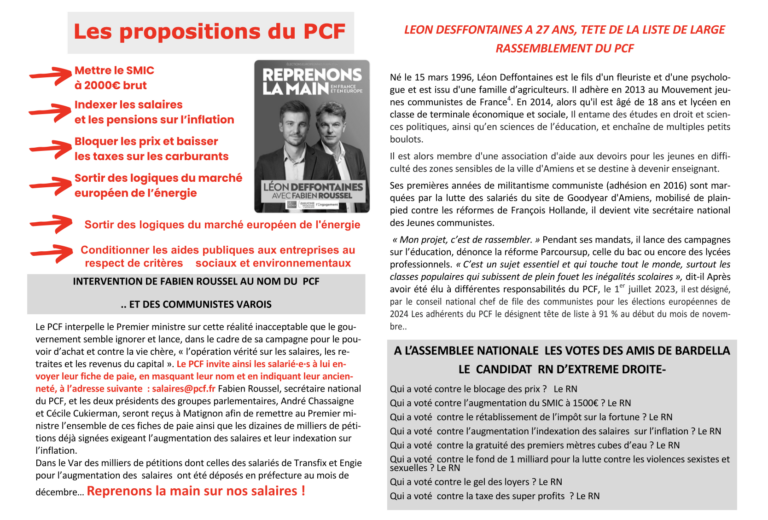 Communiqué de la Fédération du Var du PCF Hausse du tarif de l’électricité, hausse des franchises médicales, fin des aides aux agriculteurs sur le carburant de leur outil de travail. Voici les trois premières mesures du gouvernement de Gabriel Attal. Ce projet politique est sans légitimité. Les Françaises et les Français n’ont exprimé à aucun moment une telle volonté souveraine quant à des choix décisifs pour leur vie quotidienne et pour leur avenir. Ce projet politique est injuste et dangereux. Il va contre les intérêts du plus grand nombre, fragilisé par les effets de l’inflation et de la vie chère,…