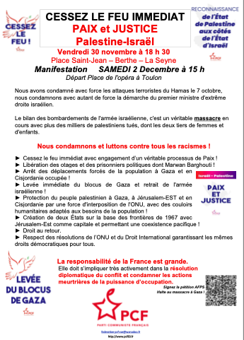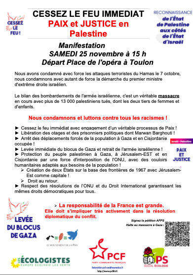 Manifestation SAMEDI 25 novembre à 15 h. Départ Place de l’opéra à Toulon Nous avons condamné avec force les attaques terroristes du Hamas le 7 octobre, nous condamnons avec autant de force la démarche du premier ministre d’extrême droite israélien. Le bilan des bombardements de l’armée israélienne, c’est un véritable massacre en cours avec plus de 13…