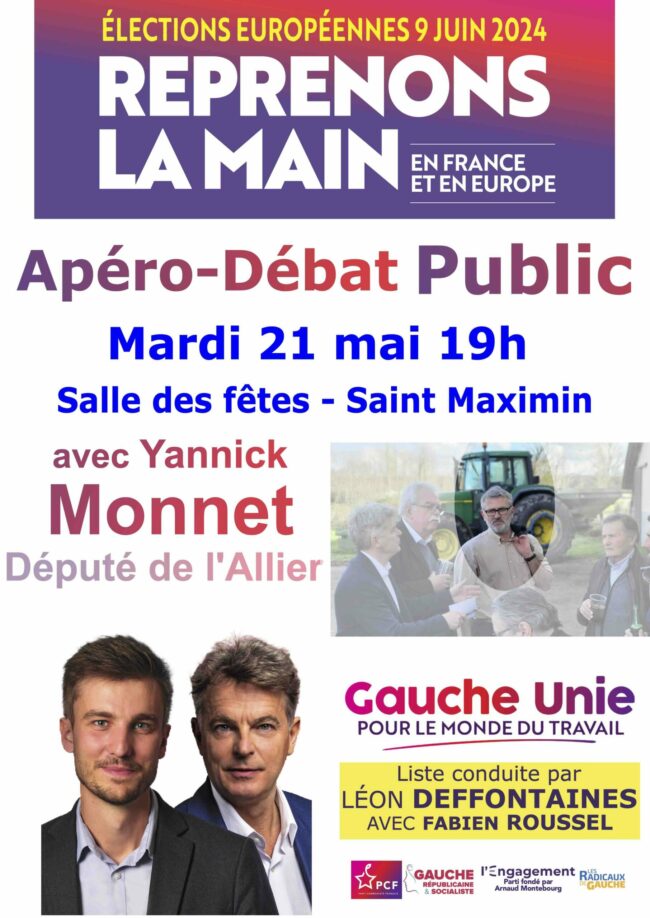 Mardi 21 mai 18h30, Salle des fêtes de Saint Maximin Rencontre-Débat : L’europe et la ruralité avec Yannick MONNET, Député de l’Allier Pour tout travail, des revenus dignes : en agissant sur l’emploi, la formation, l’augmentation des salaires, leur indexation sur l’inflation, l’égalité professionnelle femmes – hommes… ★ Une politique agricole qui protège les agriculteurs, qui leur garantisse des revenus décents,…
